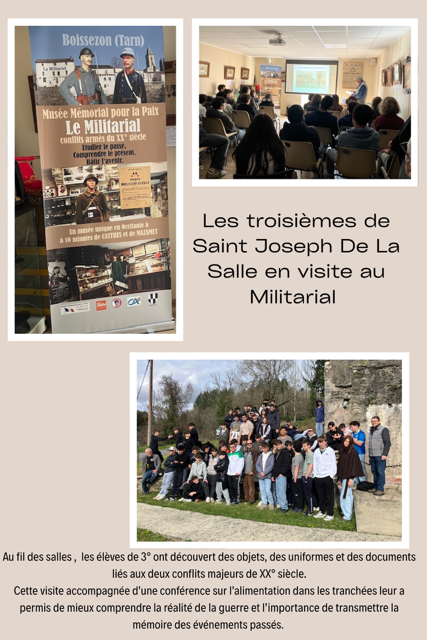 Le 9 mars 2026, une cinquantaine d’élèves du collège Saint Joseph de la Salle de Castres encadrés par leurs enseignants sont venus visiter le musée. Pendant que les uns suivaient une conférence sur l’alimentation des soldats dans les tranchées les autres visitaient le musée avec ensuite permutation des groupes. Une après-midi bien remplie tant pour les élèves et leurs professeurs que pour les bénévoles du musée. Merci aux élèves et à leurs professeurs d’avoir reléyé l’information sur leur site facebook.