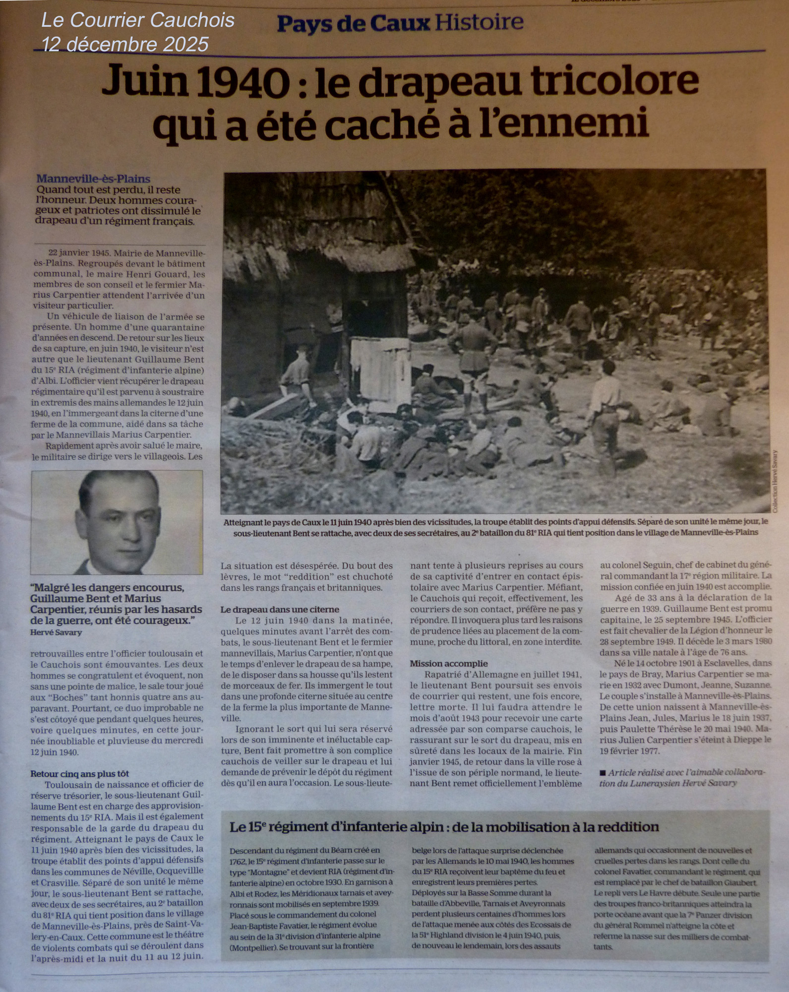 22 janvier 1945 Mairie de Manneville-es-Plains. Regroupés devant le bâtiment communal, le maire Henri Gouard, les membres de son conseil et le fermier Marius Carpentier attendent l’arrivée d’un visiteur particulier. Un véhicule de liaison de l’armée se présente. Un homme d’une quarantaine d’années en descend. De retour sur les lieux de sa capture, en juin 1940, le visiteur n’est autre que le lieutenant Guillaume Bent du 15ème RIA (régiment d’infanterie alpine) d’Albi. L’officier vient récupérer le drapeau régimentaire qu’il est parvenu à soustraire in extremis des mains allemandes le 12 juin 1940, en l’immergeant dans la citerne d’une ferme de la commune, aidé dans sa tâche par le mannevillais Marius Carpentier.